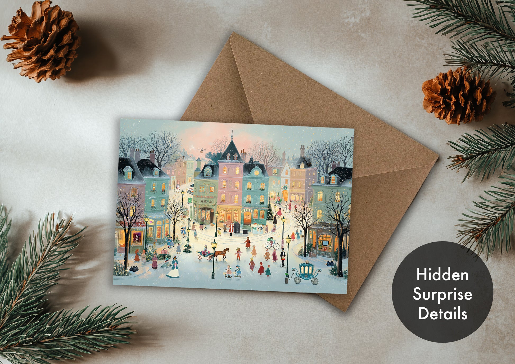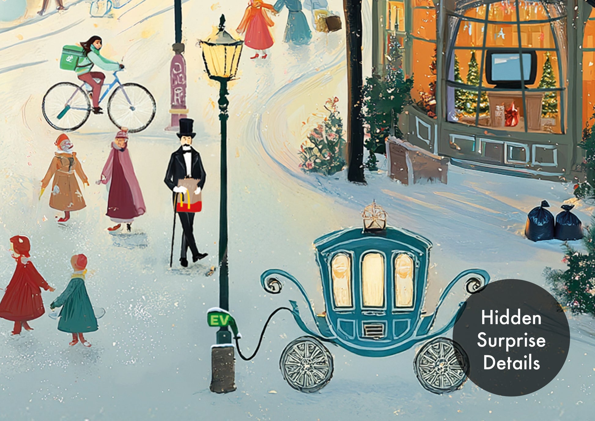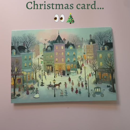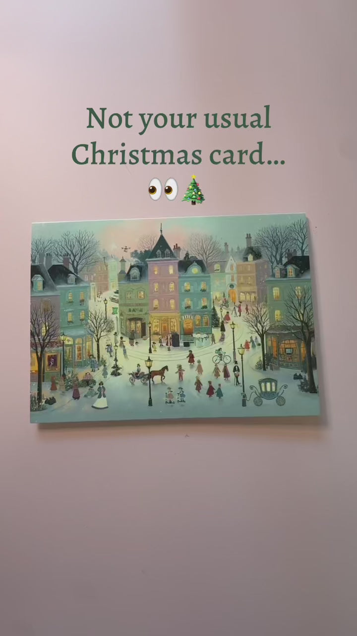 At first glance, this looks like a traditional Victorian Christmas village scene… but look closer and you’ll discover hidden modern surprises tucked into the artwork. From delivery vans to recycling bins and quirky little details, this card is full of unexpected festive fun.