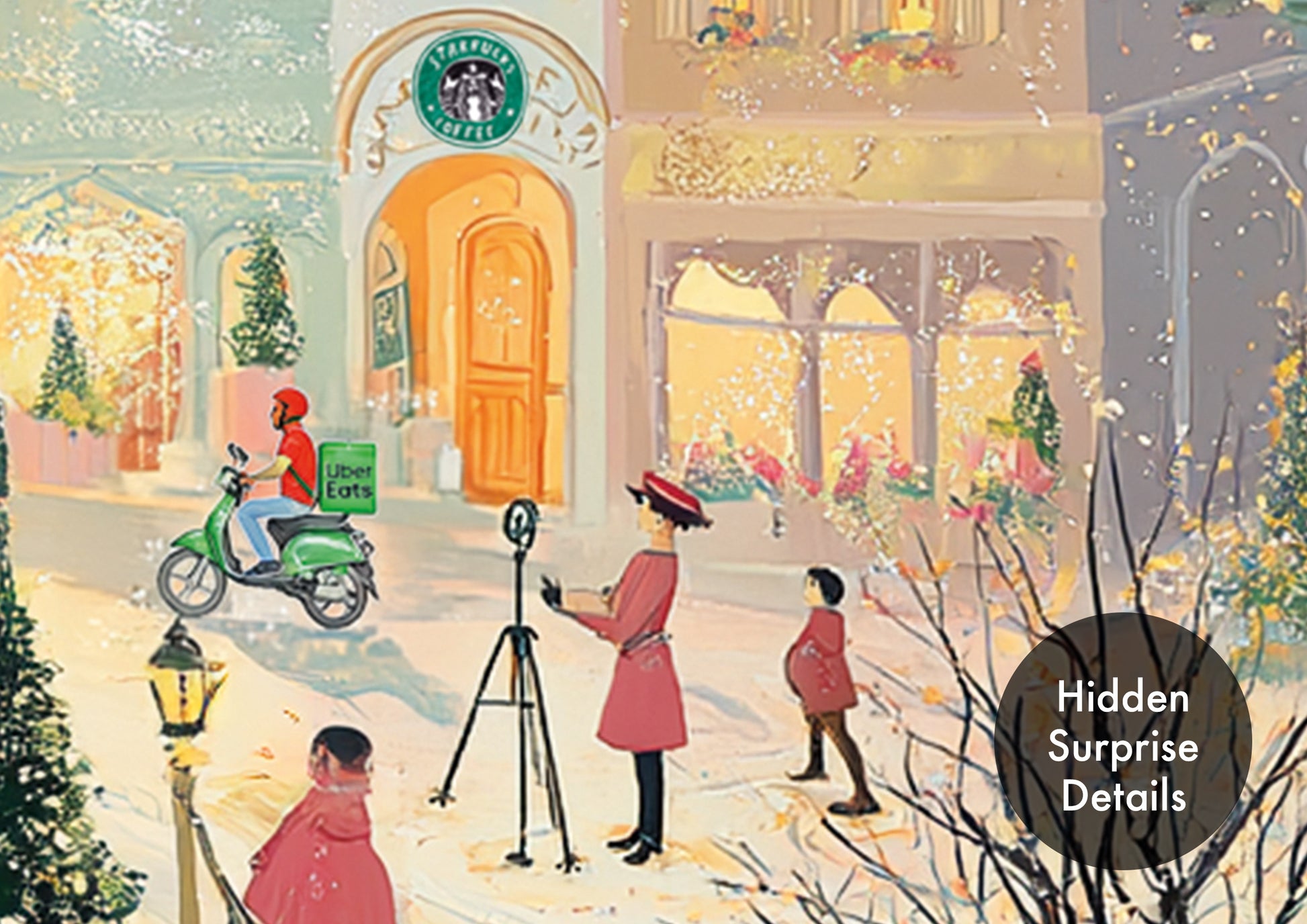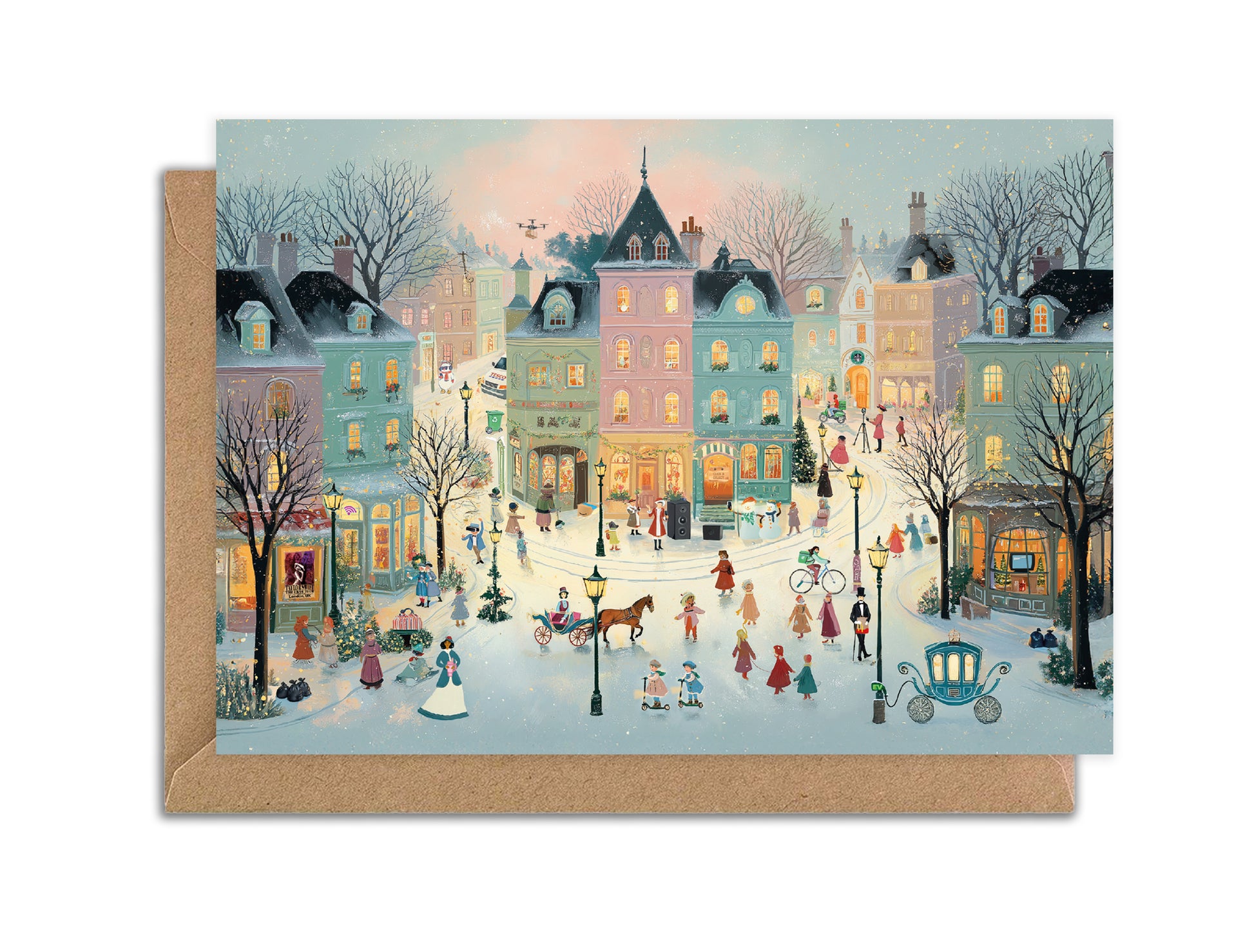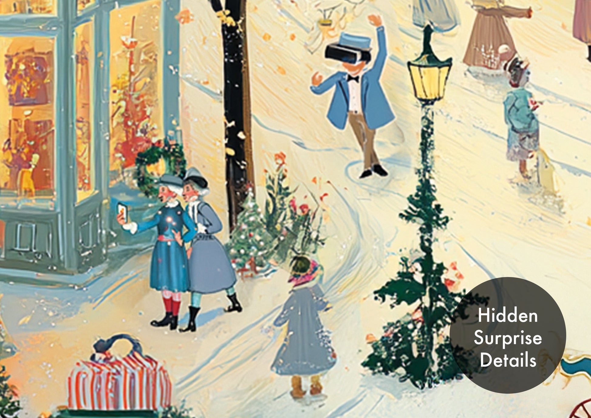 At first glance, this looks like a traditional Victorian Christmas village scene… but look closer and you’ll discover hidden modern surprises tucked into the artwork. From delivery vans to recycling bins and quirky little details, this card is full of unexpected festive fun.